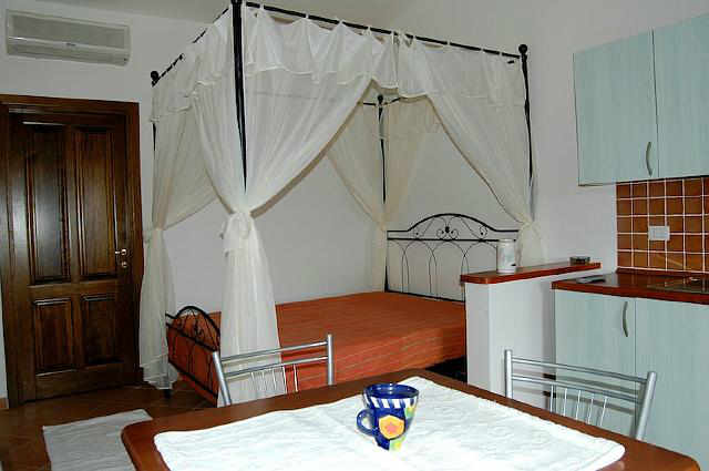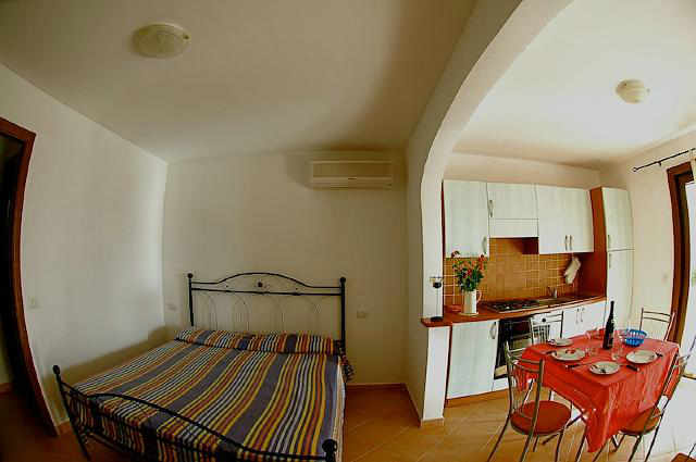 App. 1 (2+1 pers.) R-D-C: 28 m2 - 1 pièces - séjour avec coin cuisine, 1 grand lit + canapé-lit à 1 place (lit de 90), 1 sdb avec douche, Tv, air conditionné, véranda