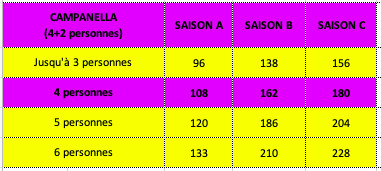 Tarif 2025 / 2026 en Euro. Par nuit, en fonction du nombre de personnes et des saisons.