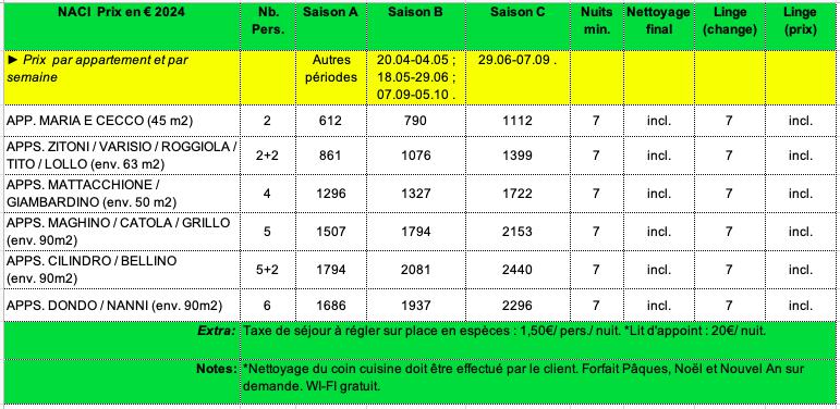 APPS. MATTACCHIONE/ GIAMBARDINO : (4 pers) : RDC : env. 50m2 – 3 pièces – séjour avec canapé et cuisine entièrement équipée (vaisselle, lave-vaisselle, réfrigérateur avec congélateur, four à micro-ondes, machine à café/ thé/ cappuccino) + 1 chambre à grand lit + 1 chambre avec 2 lits simples + 1 sdb avec douche et sèche-cheveux. Tv, ventilateur, chauffage. Sur demande : aspirateur, chaise haute et lit bébé (gratuits). Espace extérieur privé meublé.