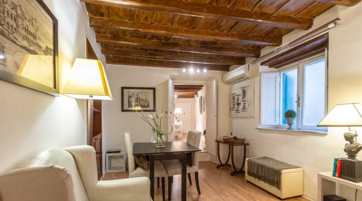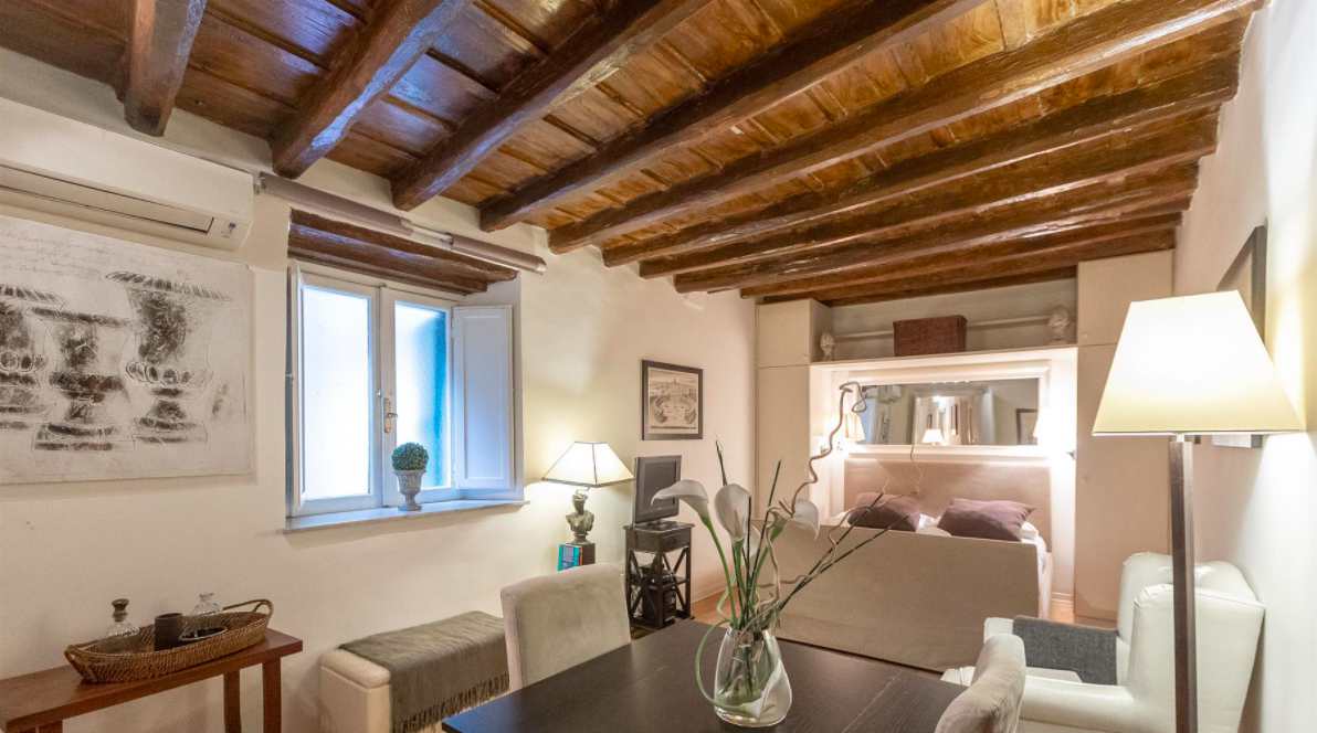 Ce superbe studio, récemment restauré par un célèbre architecte romain, situé au 1er étage sans ascenseur dans un immeuble ancien du centre historique de la ville éternelle ; immeuble protégé par le Ministère des Biens et des Activités Culturelles. Il est composé d’un seul grand espace avec lit double, un coin séjour avec canapé, un coin repas, d’une cuisine complétement équipée et d’une salle de bains avec douche. Mobilier moderne d’excellent design, plafonds en bois et parquets dans toutes les pièces complètent ce prestigieux studio.