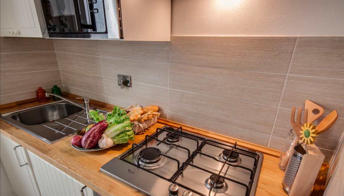 - Petite cuisine entièrement équipée avec : gazinière, four, four à micro-ondes, grille-pain, bouilloire, réfrigérateur, cafetière, vaisselle…